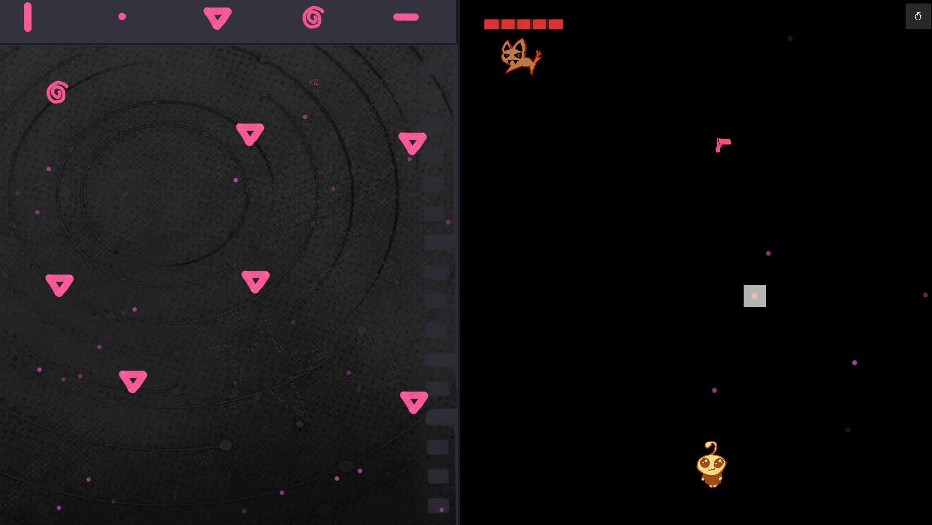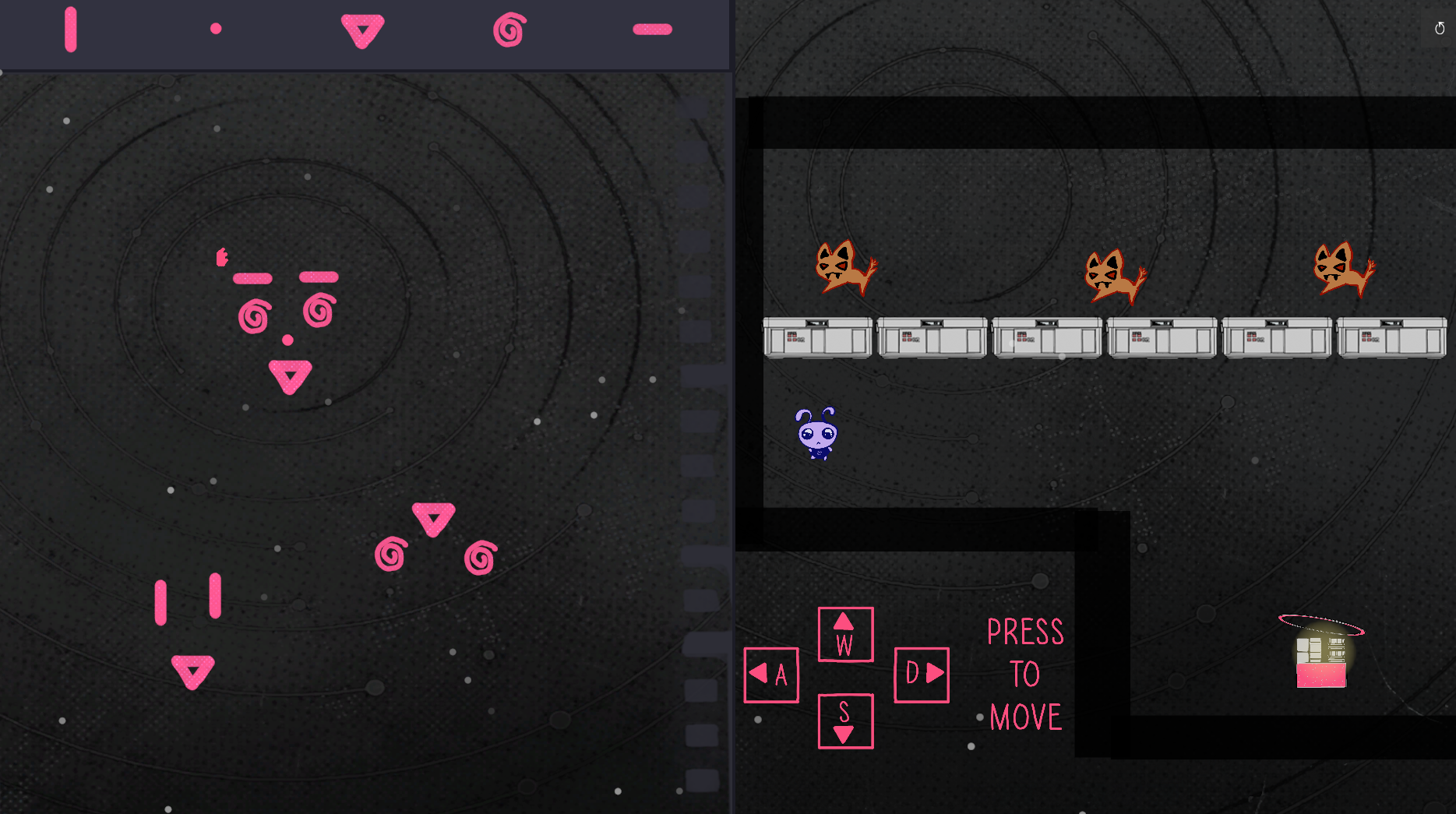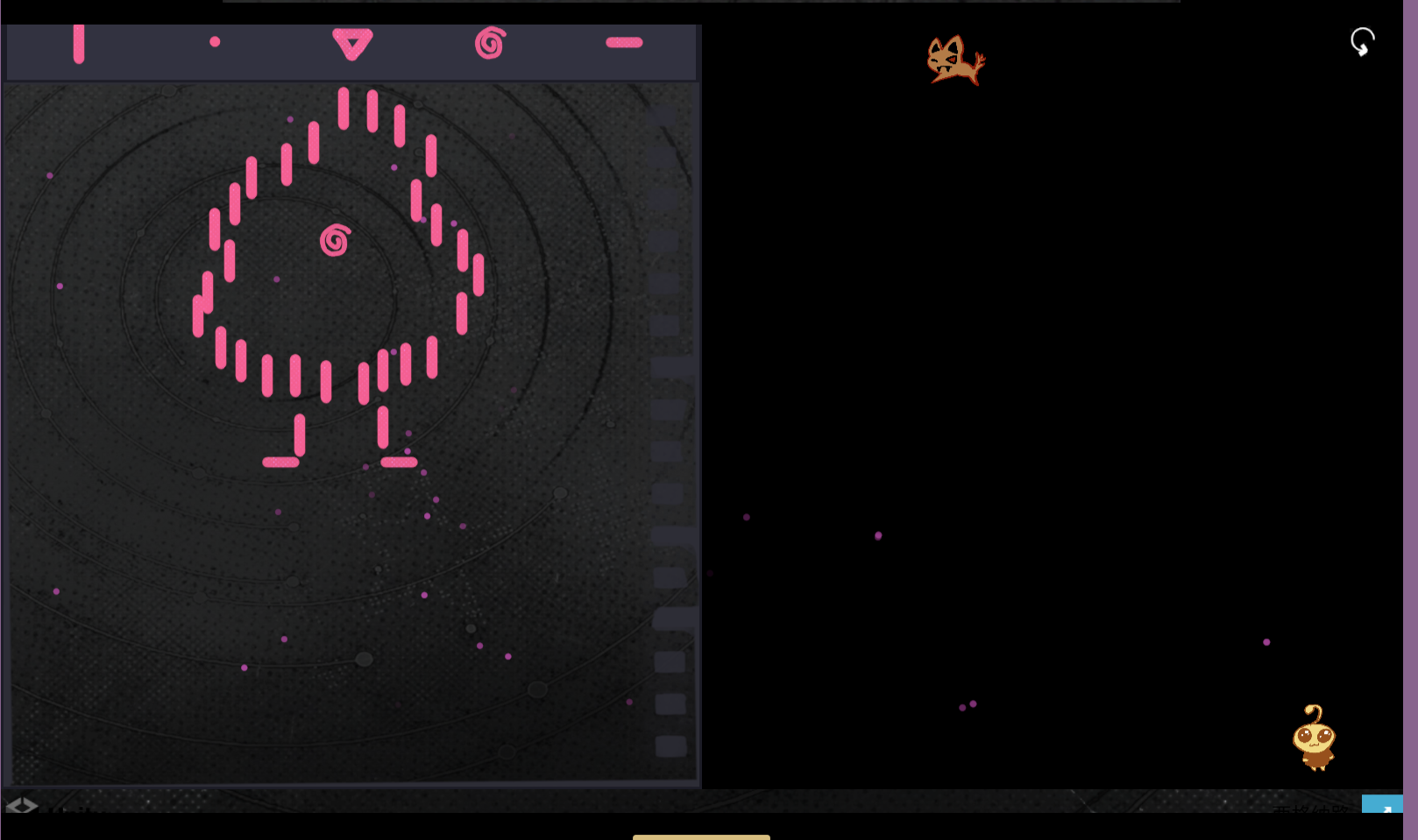这是一个俯视角2D解谜射击游戏。玩家在明暗两个阶段交替探索关卡:白天观察环境、阅读提示;黑夜中怪物出没,用特定弹幕组合击败它们。左侧画布用于记录线索、规划路线,右侧操控角色移动、射击与交互,通关需要观察力与策略的结合。